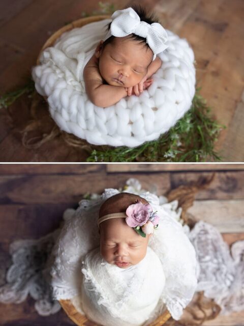 It’s best to dress your baby in simple, comfortable clothes that are easy to take on and off. Avoid clothes with too many buttons or snaps, as they can be time-consuming to remove during the session. I provide everything that you need for the session, including outfits, hats, headbands, decorations, baskets, posing fabrics, and swaddles. If you have any special prop outfit you want to bring, please let me know, and I will plan on it.